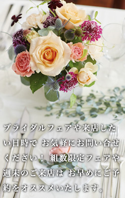ブライダルフェアや来店したい日時で、お気軽にお問い合わせ下さい!組数限定フェアや週末のご来店は、お早めのご予約をオススメいたします。